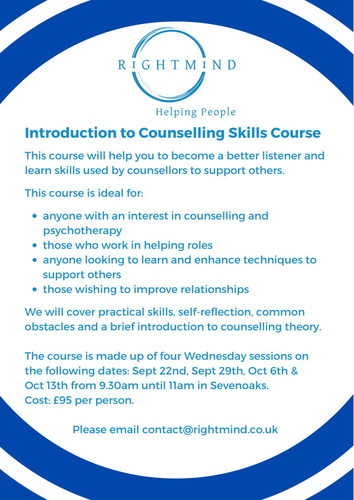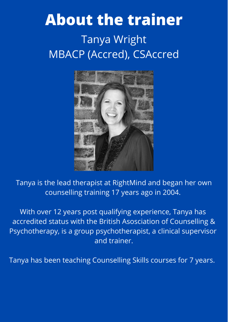 Counselling Skills Course Posted byTanyaTaylor-WrightJuly 6, 2021Posted inUncategorized Share this: Click to share on X (Opens in new window) X Click to share on Facebook (Opens in new window) Facebook Like Loading... Related Published by TanyaTaylor-Wright Accredited Counsellor and Psychotherapist. Head of Practice at RightMind Therapy & Training. View more posts