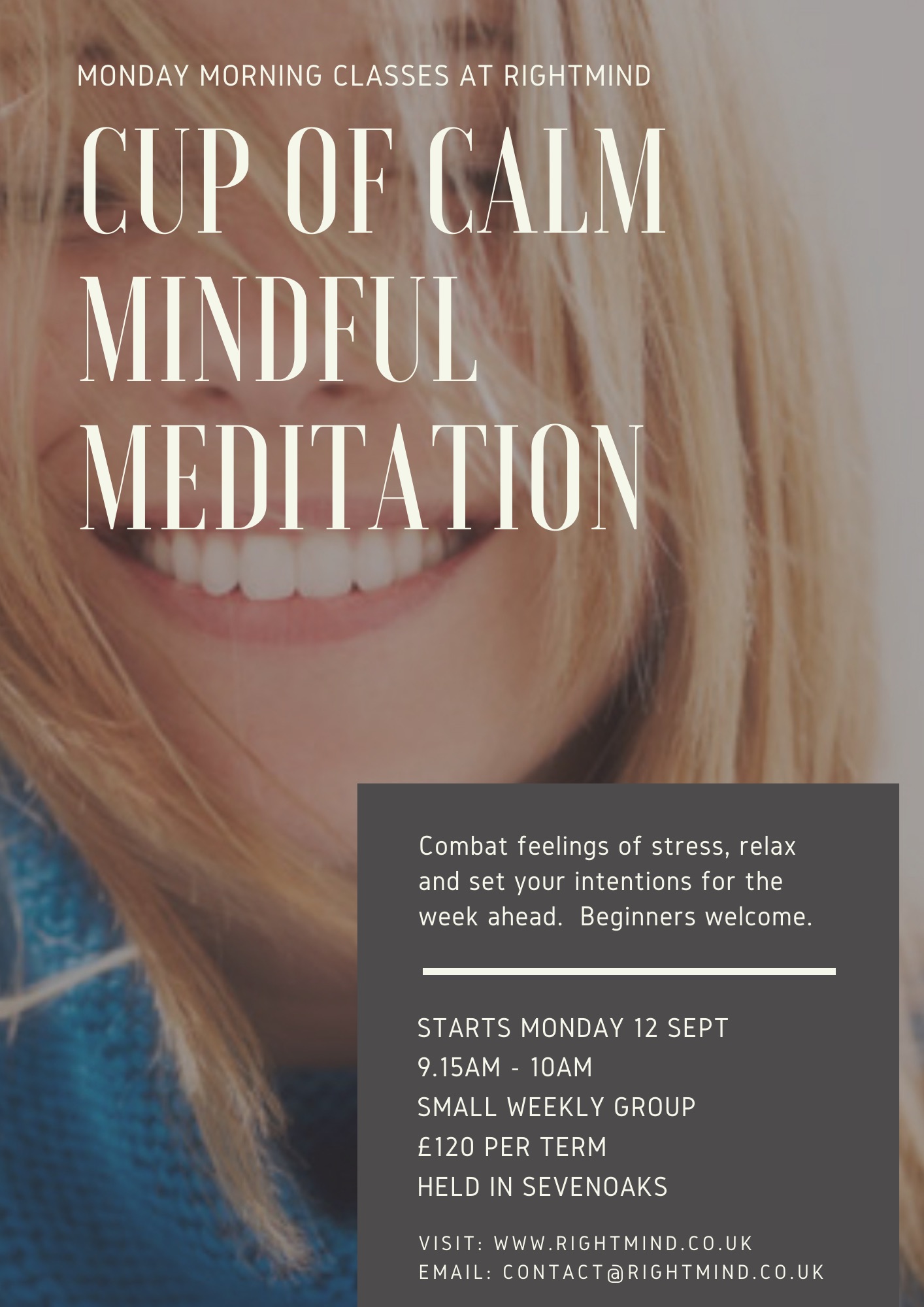 Led by Tanya Wright MBACP (Accred) who is Head of Practice at RightMind, an accredited psychotherapist and has been teaching meditation since 2010.